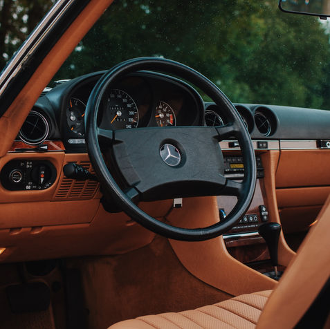 The Mercedes-Benz we are offering is a beautiful Mercedes-Benz SL 500 with German first delivery in the colour combination petrol-metallic/dattel brown. The SL model series 107, which was launched in 1971 as the successor to the so-called "Pagode" (Mercedes-Benz W 113), established a new design line at Mercedes-Benz with its wide-band H4 headlights and large fluted tail lights. A slight wedge shape indicated improved aerodynamics. The designer responsible for this series was once again Friedrich Geiger, who had already been responsible for the timeless creations of the 300 SL (including the Roadster) and the Mercedes-Benz 500 K.